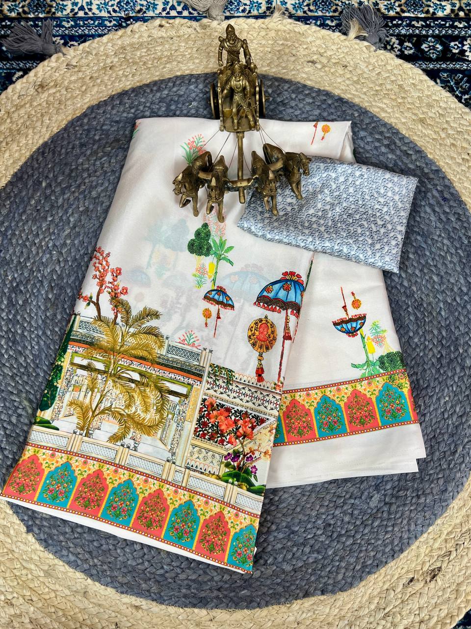 White Heritage Print Satin Saree Digital Print Original Japan Satin (Devsena satin)